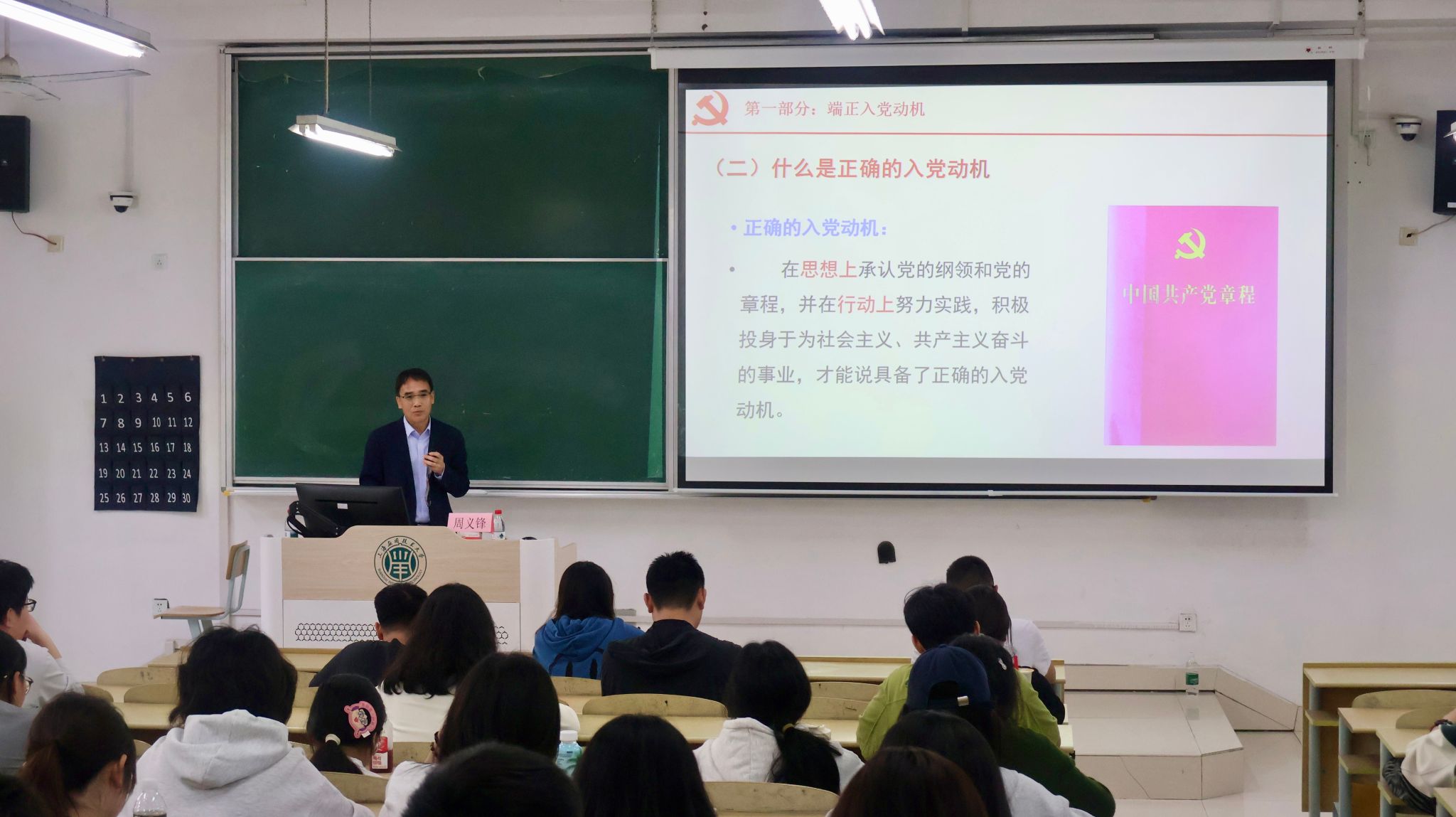 周义锋从“什么是入党动机”入手,系统阐述了正确入党动机的内涵与重要性。他引用毛泽东同志在延安文艺座谈会上的讲话,指出“思想上入党”才是真正的入党,强调只有在思想上承认党的纲领和章程,并在行动上积极投身于为社会主义、共产主义奋斗的事业,才能称得上具备正确的入党动机。