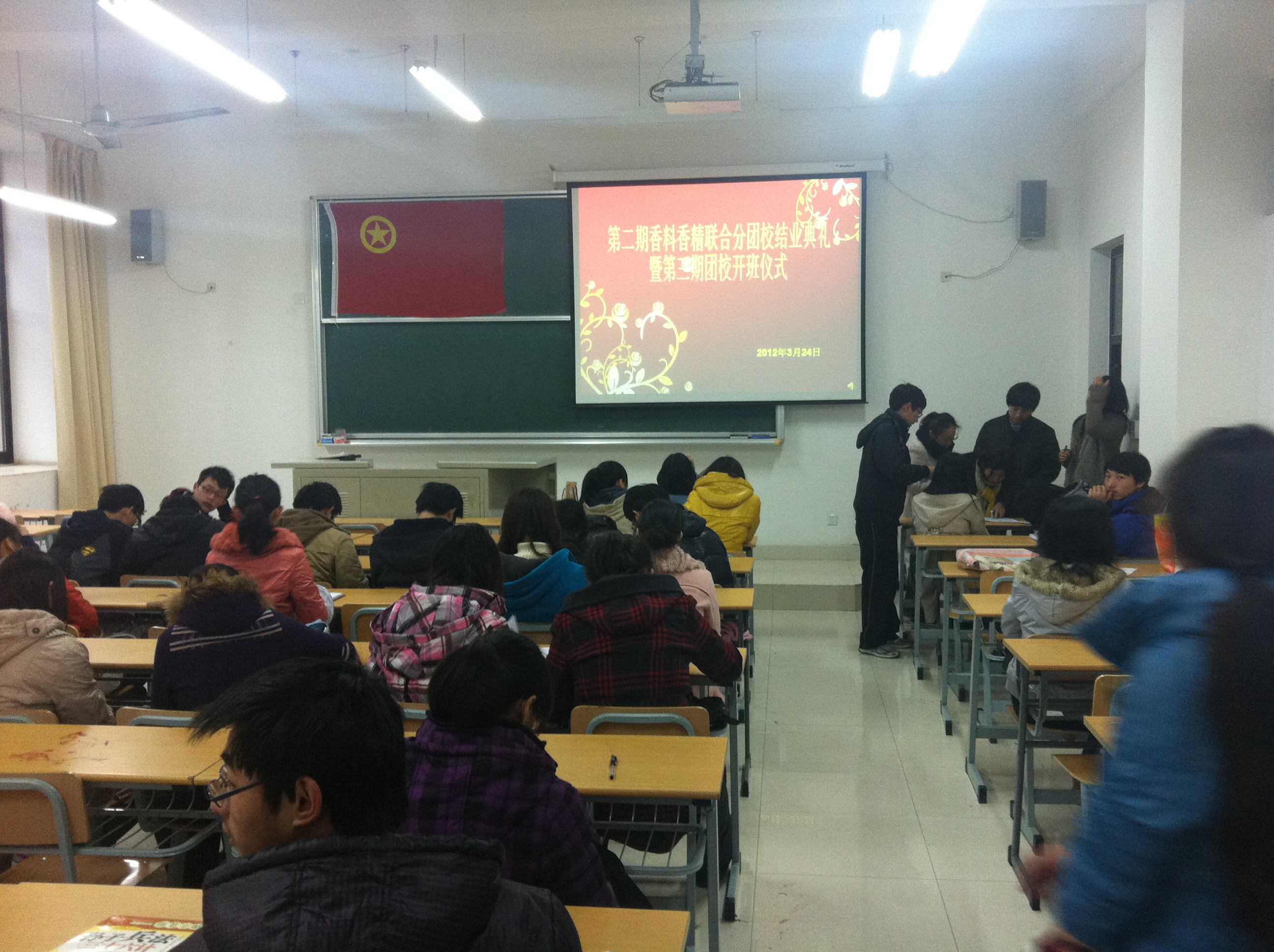 在激昂的团歌声中,新一期团校成员全体起立,对团旗行注目礼,许下自己虔诚的誓言。香料香精技术与工程学院第三期期团校正式开班,校学工部张化老师以“团员意识”和“团干部”为关键词为新学员带来了第一节课。他轻快幽默的授课方式赢得了同学们的阵阵笑声和掌声。团校学员纷纷表示,此次团课清晰了自己参加团校的目的,了解了作为团员先锋的义务,更有信心成为一名合格的团校成员。